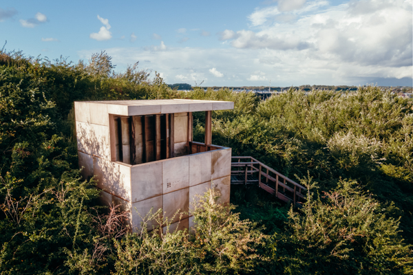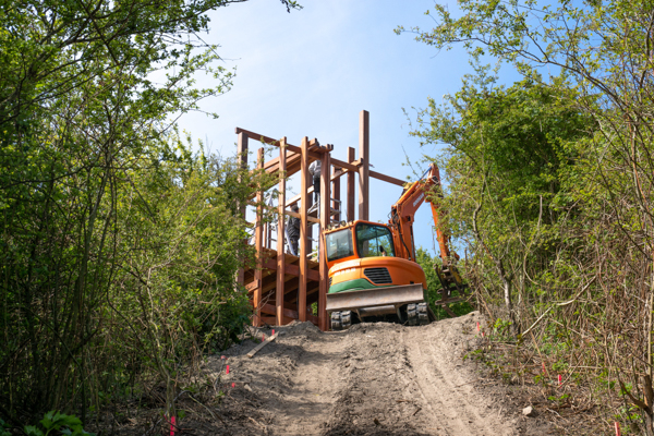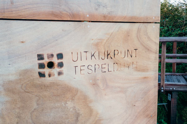 Het ontwerp is geïnspireerd door gestapelde bollenkisten en ontworpen door onze eigen architect. Het uitkijkpunt ligt tegen de helling van een voormalige vuilstort en nu golfbaan van Tespelduyn. Het is gerealiseerd inclusief trappartij en toegangsbrug. De trap is opgebouwd uit 5 bordessen en 5 trapdelen, volledig vervaardigt uit hout. Om toegang te verschaffen is een brug aangelegd bestaande uit stalen liggers, houten dekdelen en een houten leuning.