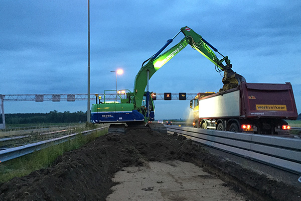 Alle werkzaamheden zijn in de nachtelijke uren uitgevoerd. Onze effectieve uitvoeringstijd per nacht was gemiddeld van 23:30 uur tot 04:30 uur. Iedere nacht dat er werkzaamheden zijn uitgevoerd door AW Grond, Weg & Water, was een afsluiting van twee rijbanen noodzakelijk om de veiligheid van ons personeel te kunnen garanderen. Comol5 heeft de vergunningen hiervoor geregeld bij Rijkswaterstaat, zodat AW Grond, Weg & Water zelf afstemming kon houden met de begeleider van de verkeersafzettingen.