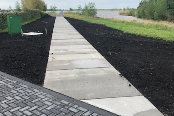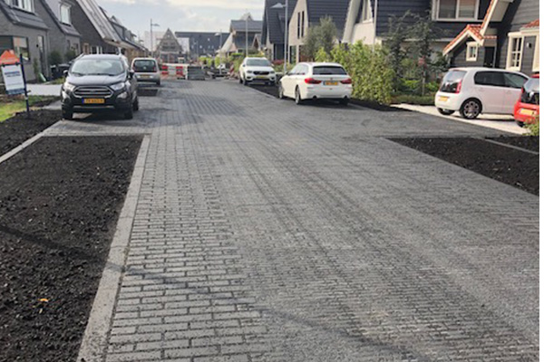 AW Rijneveld Infra begint met het opbreken en afvoeren van 1.600 betonplaten. Vervolgens wordt er een cunet ontgraven. Daarnaast brengen we waterdoorlatende funderingslagen en – elementverhardingen aan. Wanneer een groot oppervlak wordt verhard, is er voor regenwater minder mogelijkheid om natuurlijk weg te lopen. Het meeste water loopt dan via het riool weg, waardoor er veel druk komt te staan op het rioolnetwerk en straten blank kunnen gaan staan. Door waterdoorlatende materialen te kiezen, kan het hemelwater alsnog in de ondergrond weglopen.