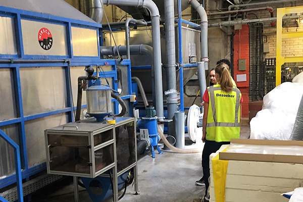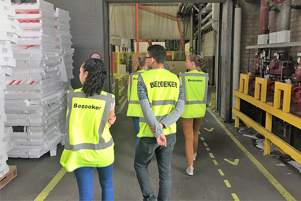 Na een introductie over het bedrijf werden we meegenomen de fabriek in. Hier kregen we een uitgebreide uitleg, van het maken van ‘piepschuim’ bolletjes tot het verwerken ervan. Van de bolletjes worden metershoge blokken geperst die tot kleinere onderdelen worden versneden met gloeidraden. Voor de verpakkingsindustrie worden verschillende vormen aan de hand van mallen gemaakt.